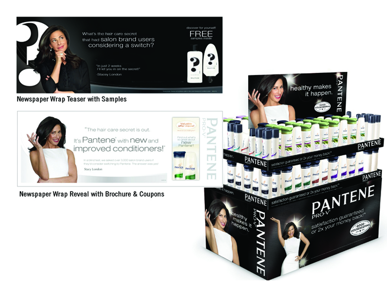 We designed a Sunday newspaper wrap program which initiated with a teaser message including unbranded samples. Consumers were asked to try the product to discover great results, followed up two weeks later with a wrap that revealed the product to be Pantene, plus coupons to drive them to store.
